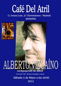 El próximo sábado 5 de mayo, a las 20:00 horas el Café del Atril (c/Jesusa Lara, 37, frente a Supersol) de la Colonia de Torrelodones, será escenario de un concierto del cantante y compositor mallorquín, Alberto Vizcaíno. Le acompañará en la «rockpopción de autor», José «Jas» Álvarez (teclados y coros).La primera consumición tendrá un sobrecargo de 5 euros, informó Café del Atril. Asimismo, comunicó que las copas cuestan 4,20€, la cerveza (33 cl) 2,40€, y los refrescos 2€, igual que el café o infusión.